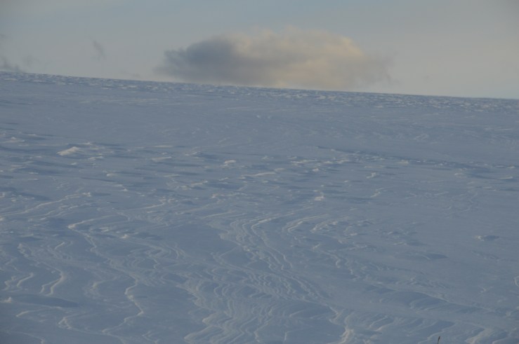 As Sasha crested the ridgeline, she was startled to discover they were on a bluff that towered hundreds of feet above the base. A narrow shelf ran perpendicularly, barely wide enough for a sled. The whistling wind inundated all with blinding clouds of blowing snow. Winds driven up the face of the cliff would collide with and part the curtain to reveal a vast, featureless plain below. As far as she could see, nothing but flat, frozen windswept tundra greeted her.