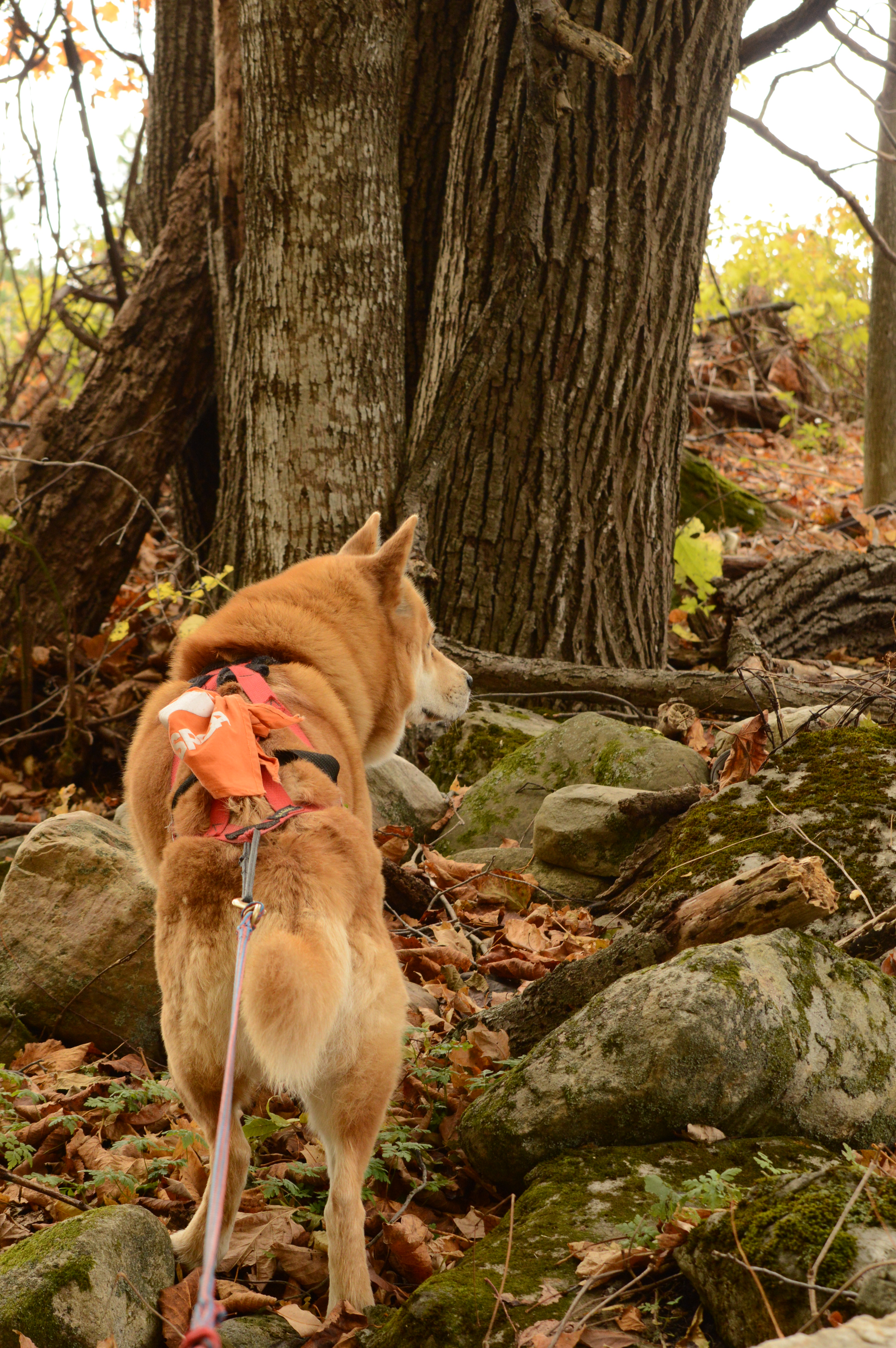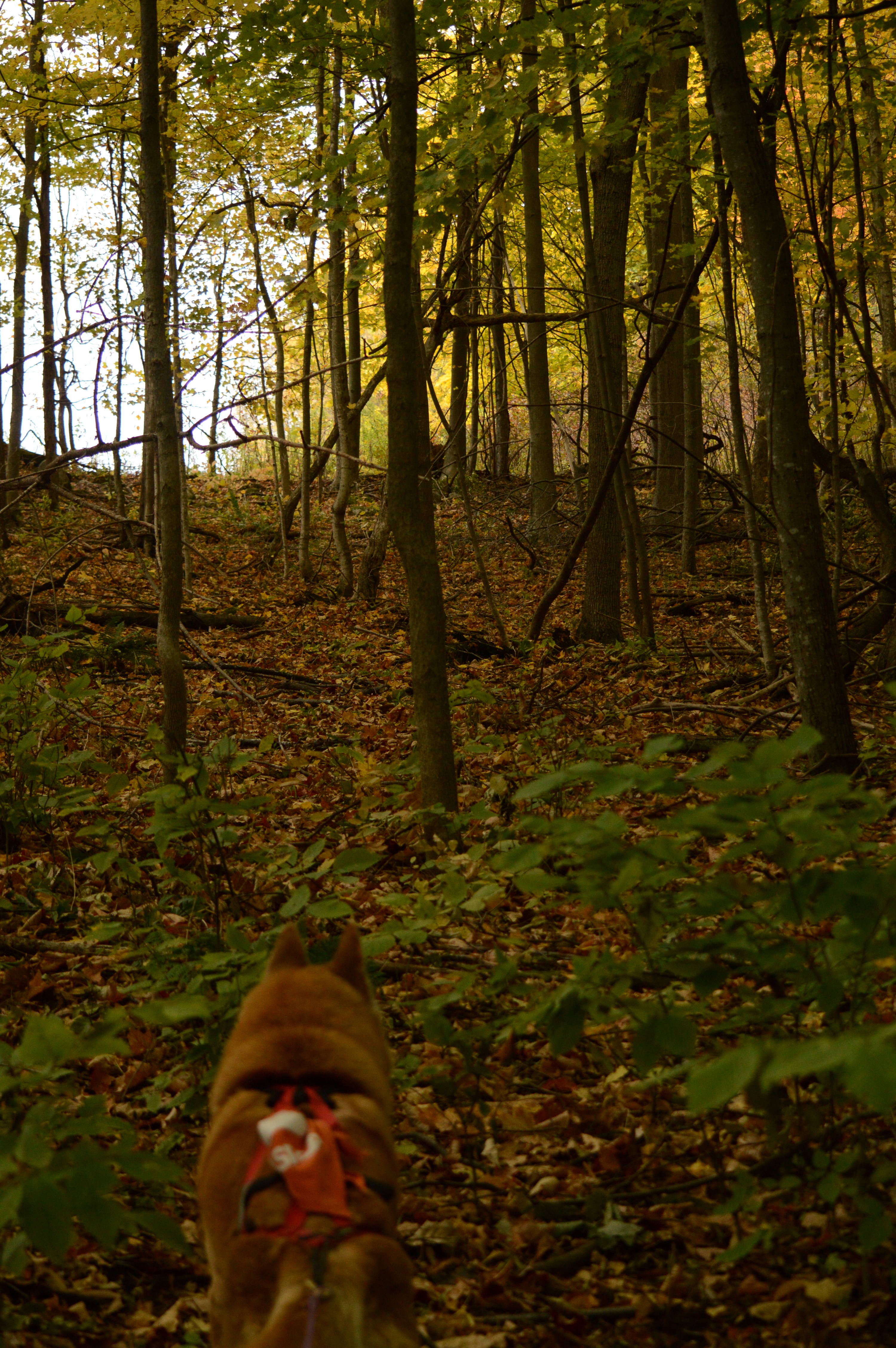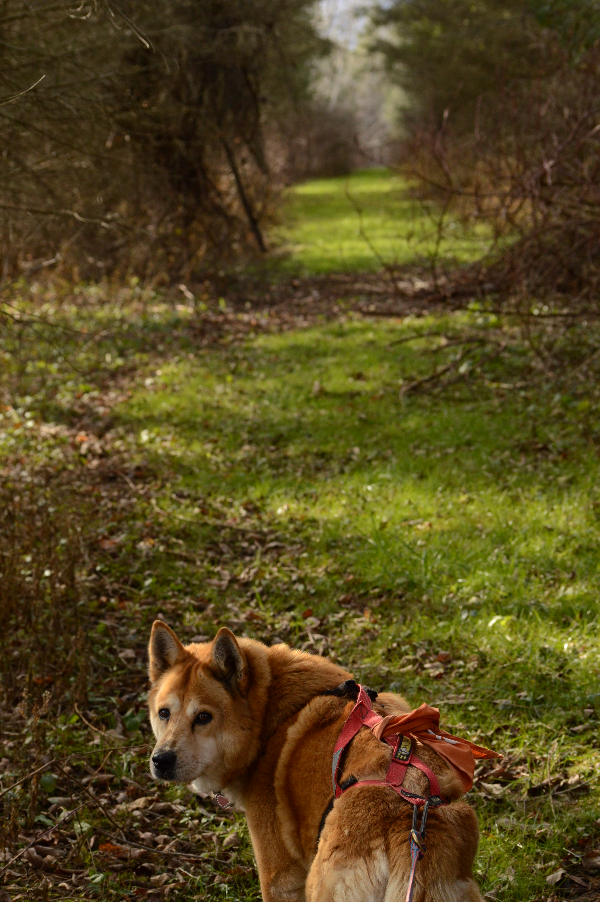 On the trail, my person, slow enough as it is, insisted on stopping and taking photographs. At one point, I could smell the bunnies in the thicket right ahead of me, and I forgot that he said the “Hold up!” command. I took off after the bunny scent and pulled him over on his backside! I didn’t mean to, but afterward I thought it was kinda funny.
