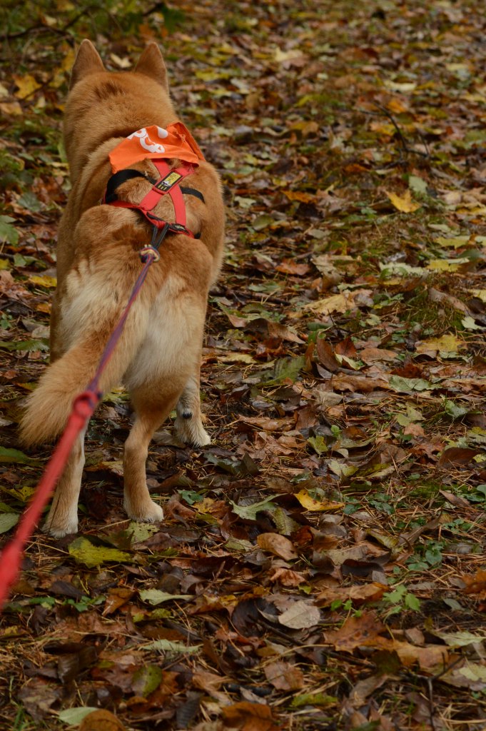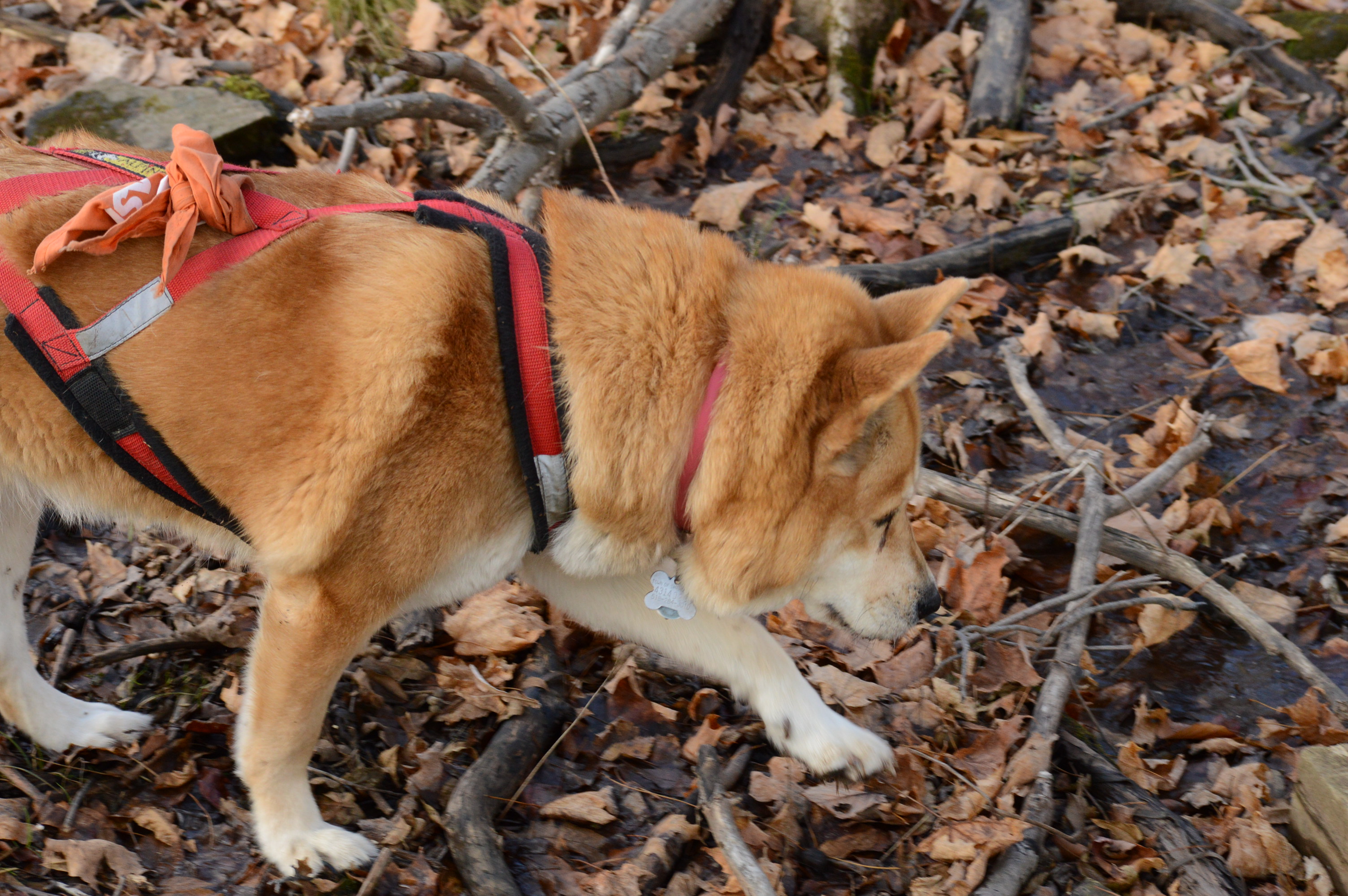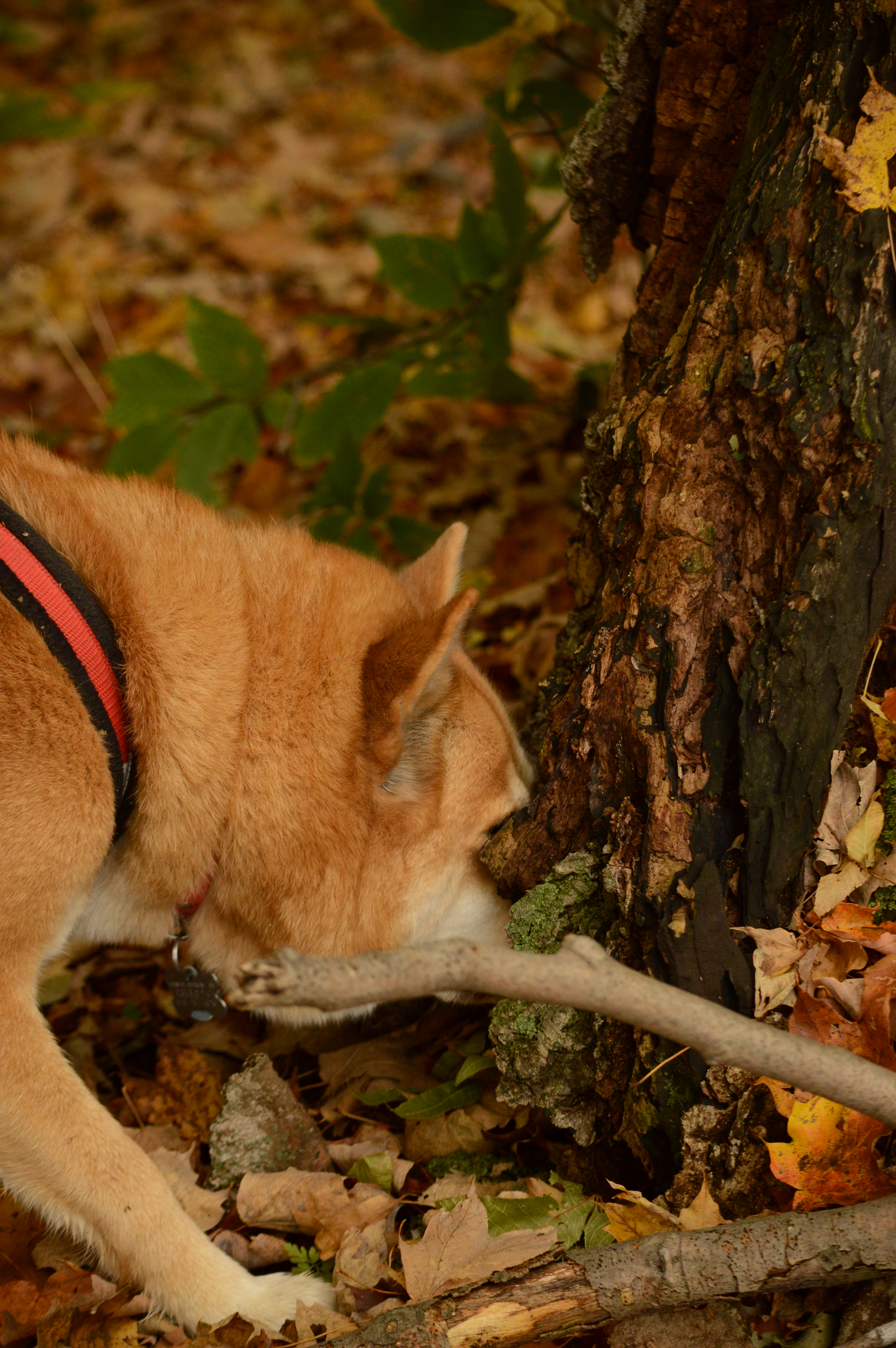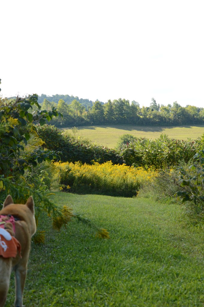 On the trail, my person, slow enough as it is, insisted on stopping and taking photographs. At one point, I could smell the bunnies in the thicket right ahead of me, and I forgot that he said the “Hold up!” command. I took off after the bunny scent and pulled him over on his backside! I didn’t mean to, but afterward I thought it was kinda funny.