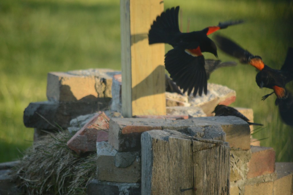 One redeeming quality to spring is that it brings the birds back with it. Black and yellow birds, orange and black birds, red and brown birds, stripy birds, iridescent birds. They really show up now, too, because mostly the world’s gray-ish where the snow is gone but it hasn’t started greening yet. By the porch those first little yellow and purple flowers came up a couple days ago. These get caught in a frog’s throat and make that noise. I know this because my person calls them Croak Assists.